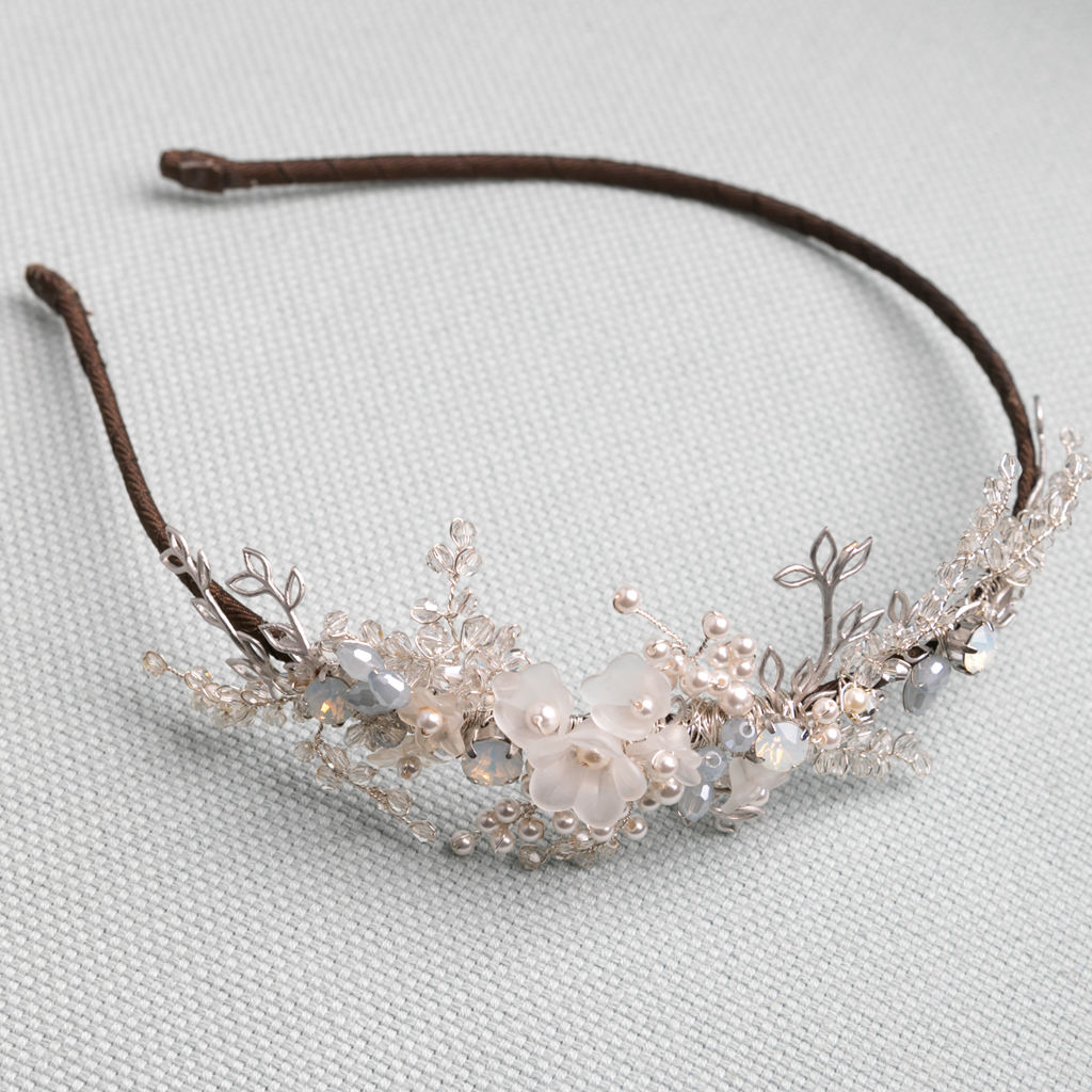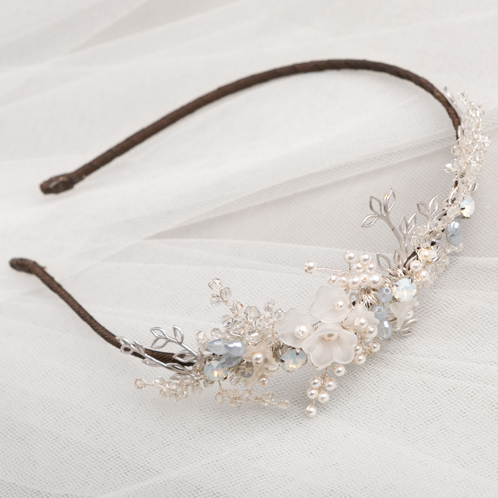 A beautiful, timeless, headdress with accents of vintage blue floral detailing.