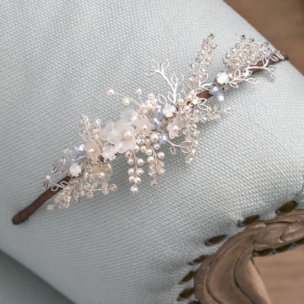 Swarovski crystals and pearls are in abundance throughout this headdress all nestled against beautiful silver leaves with opal stones and beautiful floral accents.